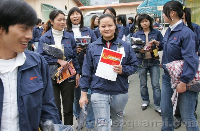 2007年1月22日下午,深圳市共青團(tuán)工作人員前往蓮塘工業(yè)區(qū)慰問(wèn)外來(lái)青工。為他們帶來(lái)了電話(huà)卡,刊物以及健康飲品,祝愿他們工作順利,春節(jié)愉快。團(tuán)市委書(shū)記張文為青工們送來(lái)了精神食品。(商報(bào)記者 商報(bào)姜志強(qiáng) 攝影報(bào)導(dǎo))