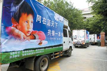 市“關(guān)愛辦”副主任吳慧艷介紹說,“深圳市學(xué)生愛心捐助”活動源于《深圳商報》的一篇報道。2006年9月,一名來自廣東省連州市的打工青年到《深圳商報》熱線新聞部求助,希望通過報紙發(fā)出呼吁,向深圳市民募集舊書籍送往他的家鄉(xiāng),為缺少課本和課外讀物的學(xué)生送去精神食糧。《深圳商報》的報道在市民中引起極大反響,不少熱心市民提著成捆成箱的書籍來到報社捐書。一些愛心企業(yè)義務(wù)組織運輸隊伍將募捐來的書籍送到山區(qū),假期出游的市民也成了捐書活動的“搬運車隊”。一年來,先后有5趟運送書籍的車隊奔赴河源、梅州等地。