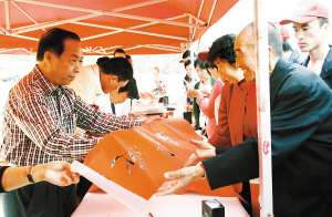 書法家為市民送春聯(lián)獻愛心。 本報記者 陳富 攝