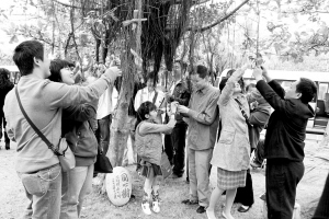 評上“幸福家庭”的殘疾人在“許愿樹”上系上紅絲帶,表達美好愿望。鄧小群 攝