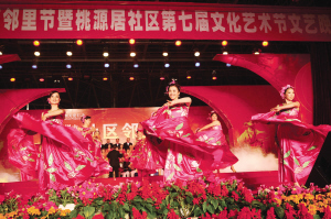當晚7時30分,在一陣歡快明亮的民樂演奏《喜洋洋》樂曲聲中,“鄰里一家親、生活樂繽紛”深圳市第三屆“社區鄰里節”暨第七屆桃源居社區文化藝術節綜藝晚會在桃源居社區大家樂舞臺拉開帷幕。整臺晚會分為鄰里親情、繽紛生活兩個樂章,16個節目緊緊圍繞本屆“社區鄰里節”主題,情景劇《家和萬事興》再現了社區居民生活原型,老年大學學員排的《軍中姐妹》表現出來的氣質讓現場所有觀眾為之一亮,肚皮舞《歡樂的春天》詼諧愉悅,讓所有居民都參與進來,相互增進友誼,社區就是一個大家庭是它的主題。