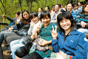 從大俠谷到云中部落的纜車上,放眼望去全是郁郁蔥蔥的樹木,嫩葉、紅花都讓醫務工作者們紛紛舉起相機,不放過眼前的美景。來自市兒童醫院的“四朵金花”更是拍攝了不少相片,楊淑芳和于媛媛兩名急診科的護士長發飄飄、十指纖纖,內科醫生徐斌開玩笑地說,別小看她們這纖纖十指,每天她們每個人都要為200多名嬰幼兒扎針。因為市兒童醫院的門急診量特別大,所以她們都練就了一手純熟的扎針本領,不論是多小的孩子,只要她們仔細觀察一番,一般都能準確地找到血管的位置。于媛媛說,踏入3月,門急診更加進入了高峰期,平時一個星期最多只能休息一天,盡管喜歡大自然,但很少有機會能出來走走,所以今天機會難得,她們一定要多拍點美照。