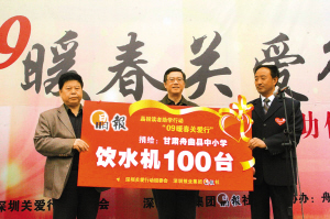 深圳報業集團黨組成員、副總編輯、晶報總編輯陳寅(中)向舟曲縣教育局書記(左一)和舟曲縣一中校長轉贈晶報讀者捐贈的100臺飲水機。