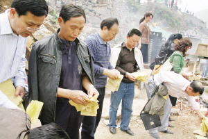 記者于是前往景家山。上山的一條水泥路上,來自外地的憑吊者絡繹不絕。半山的遙望處,山坡崎嶇,有群眾在這里設立了幾個簡單的祭祀臺。祭祀臺前,自發前來的憑吊者或點香拜祭,或久久凝望默哀肅立。時近中午,一群憑吊者顯得非常特別,看上去,他們年齡在50歲左右,個個表情凝重,動情之處潸然淚下。原來,這70多人的憑吊團隊是初中74屆、高中76屆的北川中學的畢業生,現在外地工作和生活。他們告訴記者,估計周年祭的時候人多不方便,于是就提前前來拜祭。