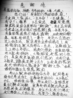 當記者來到黃瀠的住處時,黃瀠正靠在母親身邊,伏在小板凳上,拿著筆在紙上寫東西。“那么多人關心我,幫助我,我心里有太多的感觸,心里有很多話想說但是卻不知該怎么說。我想給大家寫一封感謝信,表達自己心中無限的感激……”黃瀠靦腆地告訴記者。