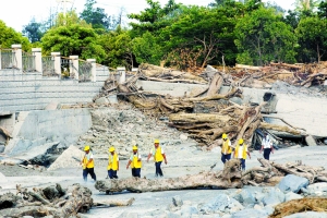 8月19日,救援人員在臺(tái)灣太麻里災(zāi)區(qū)準(zhǔn)備清理隨洪水沖下來(lái)的漂流木。新華社發(fā)