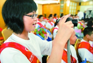 在“募師支教”出發(fā)儀式上,一位志愿者舉起相機(jī)記錄下這激動(dòng)人心的一刻。