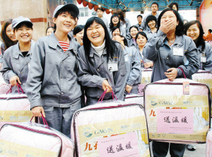 寶安區(qū)新安街道某工業(yè)區(qū)的青工們昨日欣喜地收到街道辦送來的關(guān)愛棉被。 深圳特區(qū)報(bào)記者 邱海彬 攝