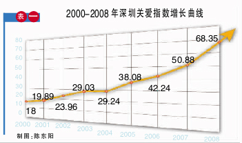 從2000年開始,有關部門對深圳的關愛指數進行研究和測量,現在又在制定一個評價關愛之城、評價愛心的指標體系。研究和測量結果表明,從2000年到2008年,深圳關愛指數增長的曲線一直在快速上升——從2000年的18上升至2008年的68.35。其中2008年,深圳的關愛指數是68.35,和2007關愛指數比,增幅高達34.34%,是同期GDP增長速度的將近3倍!(見表一)