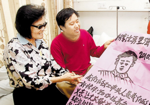 模范義工陳觀玉昨日送上她親手畫的畫幅和慰問金,鼓勵李汝勇戰勝病魔?! ∩钲谔貐^報記者 鄭東升 攝