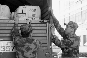 市委市政府捐贈的240萬元的棉衣棉被帳篷等昨裝車運往災區。(記者 陳曉航 孫妍/文 成江 實習生謝飛燕/圖)