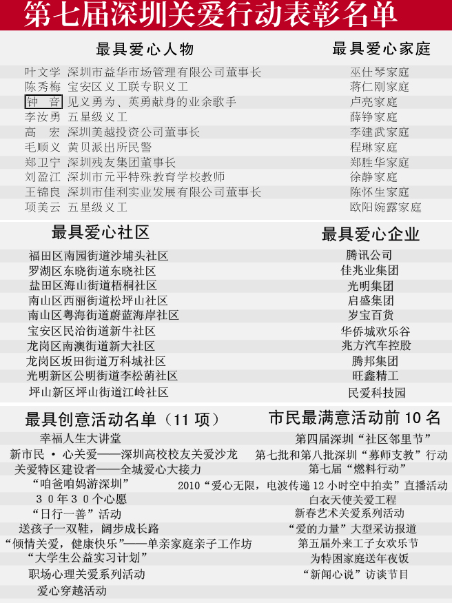 第七屆深圳關愛行動把特別獎奉獻給了深圳“五老”隊伍。3萬多名老戰士、老干部、老教師、老專家、老勞模情系后代、真心付出,贏得這座城市對他們的崇高敬意。