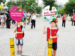 ??? 在深圳中心書(shū)城,有很多小孩子做義工提醒行人遵守交通規(guī)則。小朋友們?cè)谟眯袆?dòng)告訴大家什么是文明,“大朋友”也要注意啦!