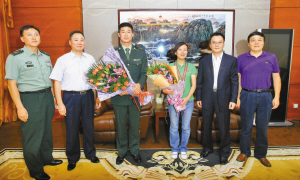 昨天,“全國(guó)道德模范”孫影(左二)和獲得“全國(guó)道德模范”提名的駐港部隊(duì)軍官黃立明(左一)載譽(yù)歸來(lái)。