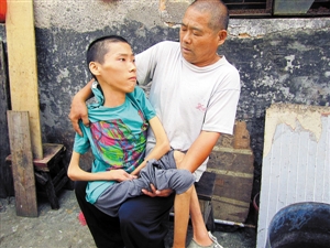 ????現(xiàn)今,王中民每每從工廠做完清潔回來,不管多晚,都會背著兒子出門,他背的姿勢也很獨特,兒子的兩只瘦腳被他夾在腋下,兩手抓著兒子的兩手。“我背習(xí)慣了,一點都不覺得他重。”