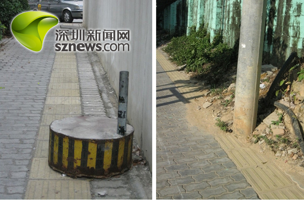 盲道上障礙重重。網(wǎng)友“chenkf”2011年拍攝于福田區(qū)中心六路周邊道路。