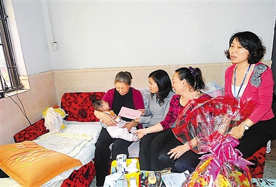 日前,社工們?yōu)槟⒁毯蛯O女送上慰問金。 深圳商報(bào)記者 管亞東攝