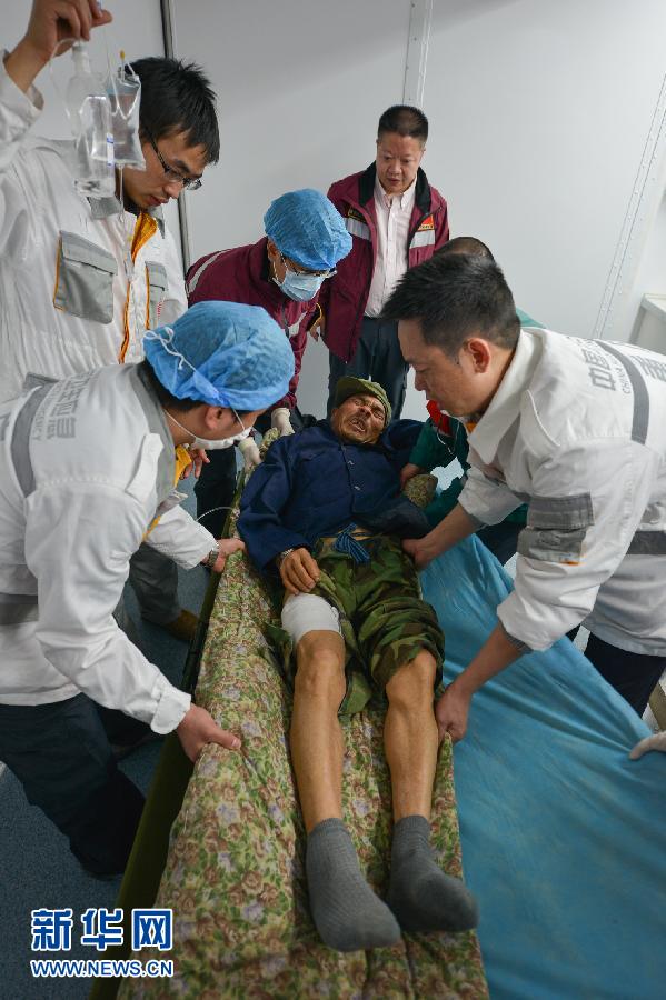 4月21日,一名寶興縣靈關鎮地區受災群眾被送到重慶緊急醫學救援隊的臨時醫療點進行救治。來自民政部的消息,據四川省民政廳21日17時統計,四川蘆山7級地震已造成208人死亡、失蹤,其中184人死亡、24人失蹤,另有11826人受傷。新華社記者李鑫 攝