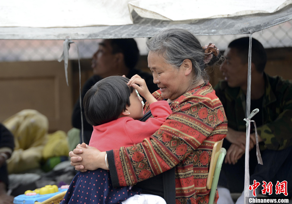 4月21日,四川省雅安市寶興縣靈關災民安置點的老婦和孩童。中新社發廖攀 攝