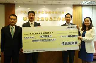 在香港中聯(lián)辦舉行的捐款儀式上,中聯(lián)辦港島工作部部長(zhǎng)吳仰偉接受了佳兆業(yè)集團(tuán)的捐款,并對(duì)佳兆業(yè)積極捐款賑災(zāi)的行為表示了敬意。他表示,每當(dāng)內(nèi)地發(fā)生災(zāi)難,香港企業(yè)和企業(yè)家都積極捐款捐物,再次表現(xiàn)出香港企業(yè)家有著深厚的愛港愛國(guó)的傳統(tǒng),希望有更多像佳兆業(yè)這樣有責(zé)任感和愛心的企業(yè),給災(zāi)區(qū)民眾帶來更多的支持和力量,幫助災(zāi)區(qū)民眾重建家園,渡過難關(guān)。中聯(lián)辦將盡快將這筆善款送往四川雅安蘆山地震災(zāi)區(qū),相信這筆捐款能夠?yàn)闉?zāi)區(qū)同胞帶去更多希望和幫助。