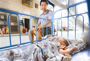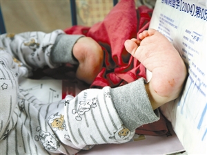 昨日下午,在凌先生的指引下,記者來到坂田水斗坑西村七巷12樓下見到了爺孫倆。爺爺正趴在一張破舊不堪的嬰兒床上,寸步不離守護(hù)著孫子,一名大約3歲的男童靜靜地躺在嬰兒床內(nèi)熟睡著。男童雙腳有缺陷,其腳心朝上腳背朝下,并且兩腳均向內(nèi)側(cè)橫長。