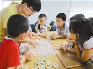 孩子們專心致志地聽老師講解下象棋的技巧。