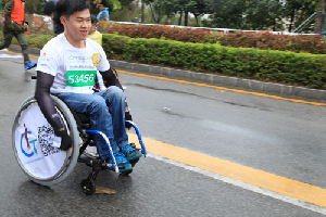 ????而去年首次參賽的24歲殘障人士林文超,今年不僅繼續參賽,用輪椅挑戰體驗組別10公里,還組織了11位殘障選手一同參加。