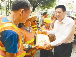 ▲街道領導楊文輝為環衛工派發大米。劉進華 攝