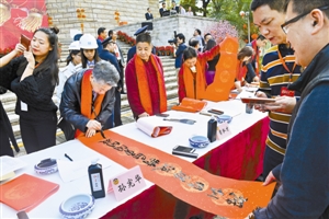 深圳晚報訊(記者 胡瓊蘭) 12月22日,“春聯(lián)來了”——第四屆全球春聯(lián)征集書寫活動首站在深圳會堂前舉辦。來自北京、深圳的知名書法家和書法愛好者在此揮毫潑墨,并將春聯(lián)等贈送給深圳各行各業(yè)的建設(shè)代表。