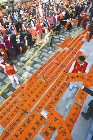 ▲書法家現(xiàn)場揮毫潑墨,春聯(lián)鋪天蓋地。