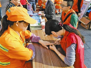 美甲師為環(huán)衛(wèi)工保養(yǎng)雙手。