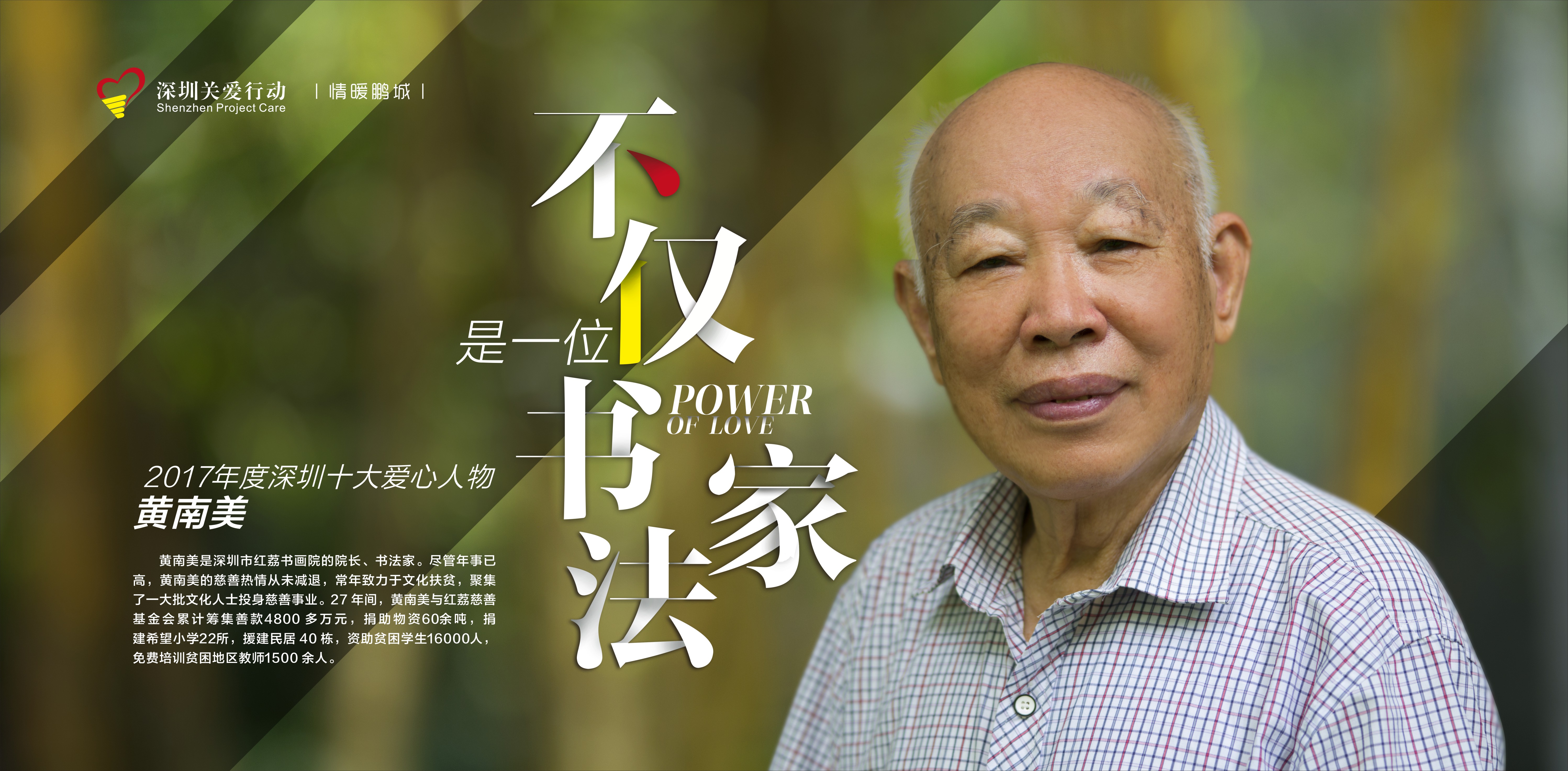男,深圳市紅荔慈善基金會永久榮譽會長。年已九十歲高齡的黃南美老人,1989年創辦深圳市第一個民辦社會文化機構——紅荔書畫館,積極參與深圳特區文化建設的同時,開創了一條文化扶貧的新路,團結了一大批愛心書畫家、 企業家和愛心人士參與到公益慈善事業。他把自己當作慈善路上的“拾柴人”,要把散落在社會上愛心的“干柴”,匯集起來,讓它們發出更大的光和熱。27 年來,從紅荔書畫館到紅荔慈善基金會,黃南美與紅荔慈善基金會累計籌集扶貧助學善款近4800 多萬元,捐助物資近60余噸,捐建希望小學22所,援建民居 40 棟,資助貧困學生1.6 萬人,免費培訓貧困地區教師1500 余人。他被評為全國公益事業杰出先進個人、中國改革開放30年百名杰出人物、鵬城慈善獎十大杰出人物等。
