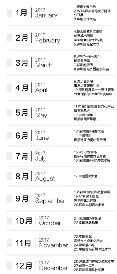 據了解,這份“菜單”共收錄了國際化、標志性的品牌文化活動28項,活動都由國際或國家權威專業(yè)機構主辦或授權,不少活動代表了我國對應領域的最高水準,是可以代表深圳國際化城市形象的“文化大餐”。