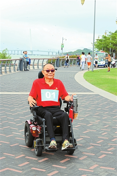 深圳市第三屆“無障礙”樂跑活動形象大使鄭衛寧是當天的1號運動員。他穿著鮮艷的紅色T恤,坐在越野無障礙輪椅上,笑容陽光,充滿自信。鄭衛寧感慨:“無障礙建設是我們殘疾人能獨立生活,能平等地有尊嚴地融入主流社會的基礎。我是懷著感恩之心來參加這個活動的。”