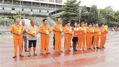 羅湖分部的小志愿者為環衛工人送上營養暖餐。