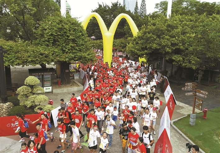 9月8日,由深圳關愛辦、深圳晚報、麥當勞深圳主辦,中國宋慶齡基金會公益支持的第五屆“為愛麥跑”深圳站活動今天在深圳錦繡中華·民俗村百藝廣場發令起跑。在起跑儀式上,深圳報業集團副總編輯鄧自強,麥當勞中國高級副總裁、首席運營官林慧蓉,深圳市關愛辦專職副主任陳勵,深圳錦繡中華發展有限公司黨委書記、常務副總經理凃國勇,麥當勞副總裁、深圳/東莞/惠州及粵西地區區域總經理張建洲,深圳晚報副總編輯童俏,麥當勞中國高級人力資源總監吳滬生以及麥當勞“四小福”,和現場3000多名小朋友及其家長穿上親子裝、紅白襪,小手拉大手完成愛心跑,見證深圳市民的愛心力量,共同助力“麥當勞叔叔之家”。