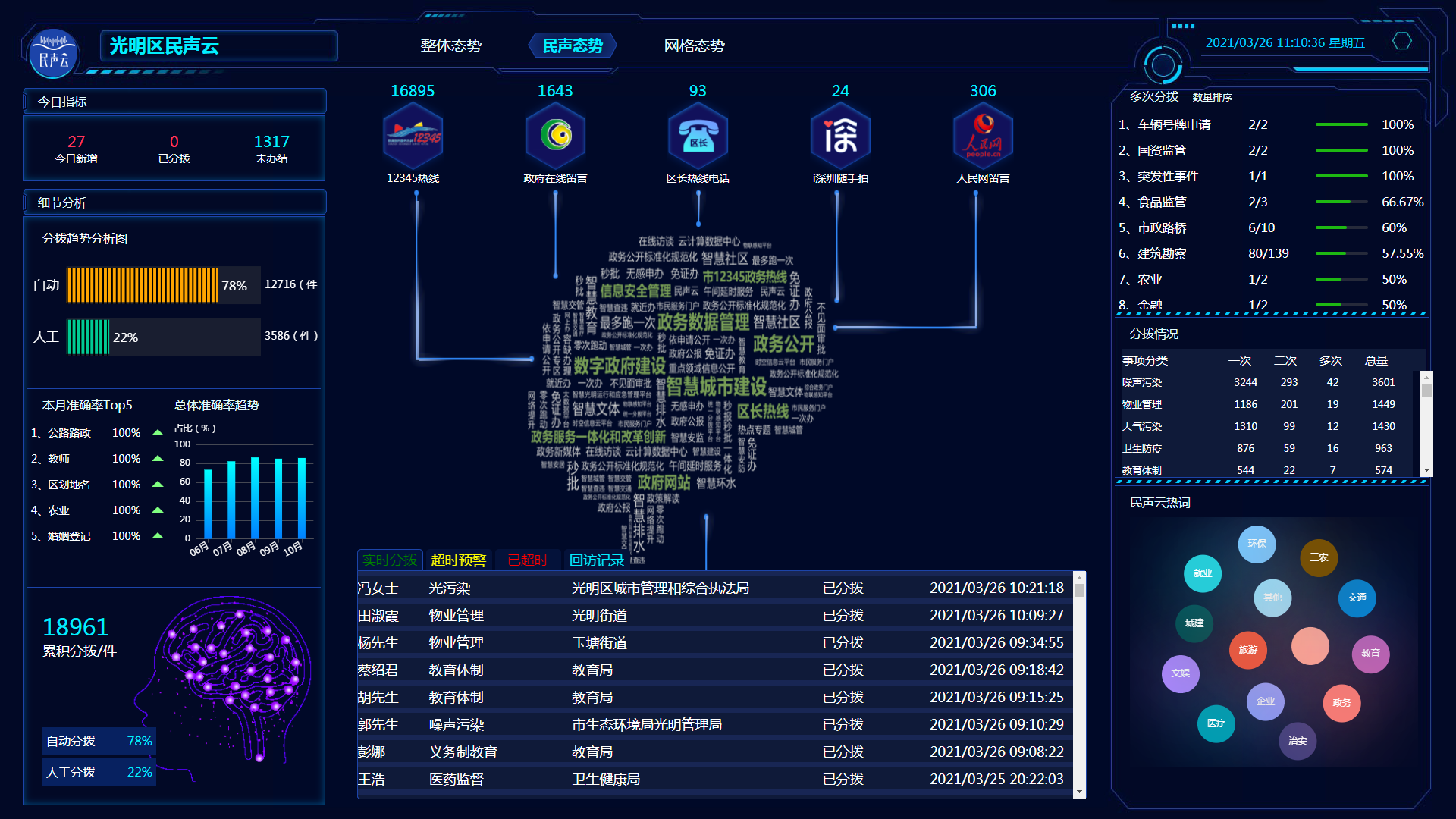 “民聲云”是集民生信息收集處置、跟蹤反饋于一體的敏捷響應(yīng)平臺,通過整合市12345政務(wù)熱線、區(qū)長熱線、政府網(wǎng)站留言信箱等民聲熱線渠道,運(yùn)用大數(shù)據(jù)、云計(jì)算、人工智能、5G等先進(jìn)技術(shù)進(jìn)行統(tǒng)一智能分撥,通過“一朵云”“一個(gè)群”“一套機(jī)制”實(shí)現(xiàn)對光明區(qū)民聲事項(xiàng)全周期的動態(tài)管理和閉環(huán)管理,提升了政務(wù)效率。2020年“民聲云”項(xiàng)目共受理民聲事件26261宗,智能分撥率達(dá)到78%,平均辦理時(shí)間壓縮近一成,回訪滿意度達(dá)95%。另外,“民聲云”還定期對所有工單數(shù)據(jù)進(jìn)行統(tǒng)計(jì)分析,形成專項(xiàng)分析報(bào)告,供光明區(qū)領(lǐng)導(dǎo)作決策參考。作為社會治理現(xiàn)代化的重要一環(huán),“民聲云”目標(biāo)就是通過治理追求“善治”,最終形成社會治理綜合生態(tài)平臺。