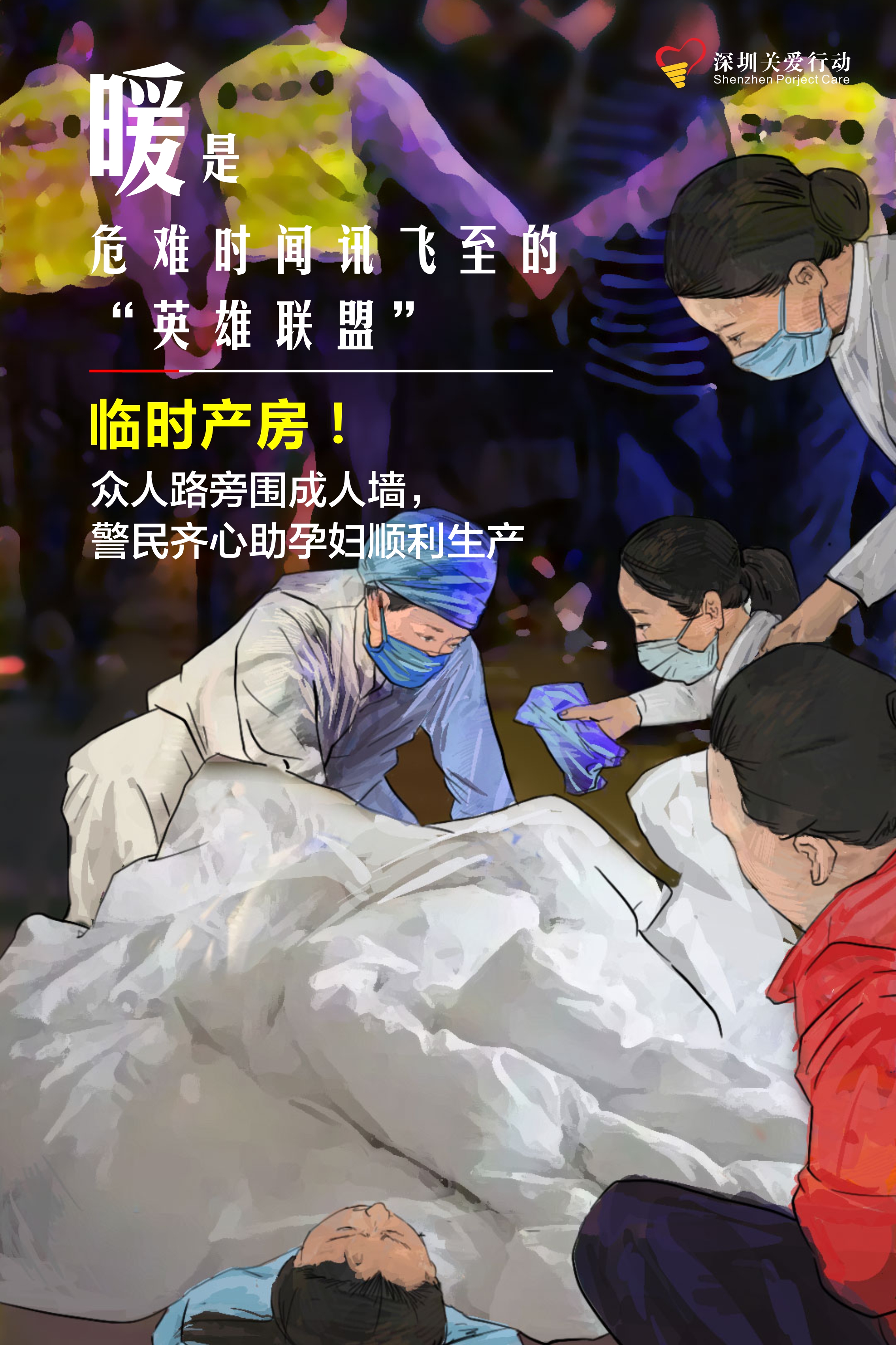 2021年5月16日深夜零點左右,懷孕的羅女士忽然感到肚子疼痛,趕緊準備前往醫院。在丈夫的攙扶下,羅女士走到公明第二小學附近路邊,猛然間更大的痛感襲來,她一下坐到了地上,發現孩子已迫不及待要與這個世界見面。就在擔驚擔心、不知所措時刻,接到光明交警大隊分中心指令的光明交警大隊公明中隊鐵騎隊員舒鵬飛、曾浩、薛俊鋼、李輝強快速趕到現場,在孕婦周圍拉起警戒線,周圍熱心市民也匆忙拿來雨傘作為遮蔽物,與鐵騎隊員并肩圍成人墻,隨后醫護人員也趕到了。孩子順利降生,母子平安,鐵騎隊員又將他們護送到醫院。