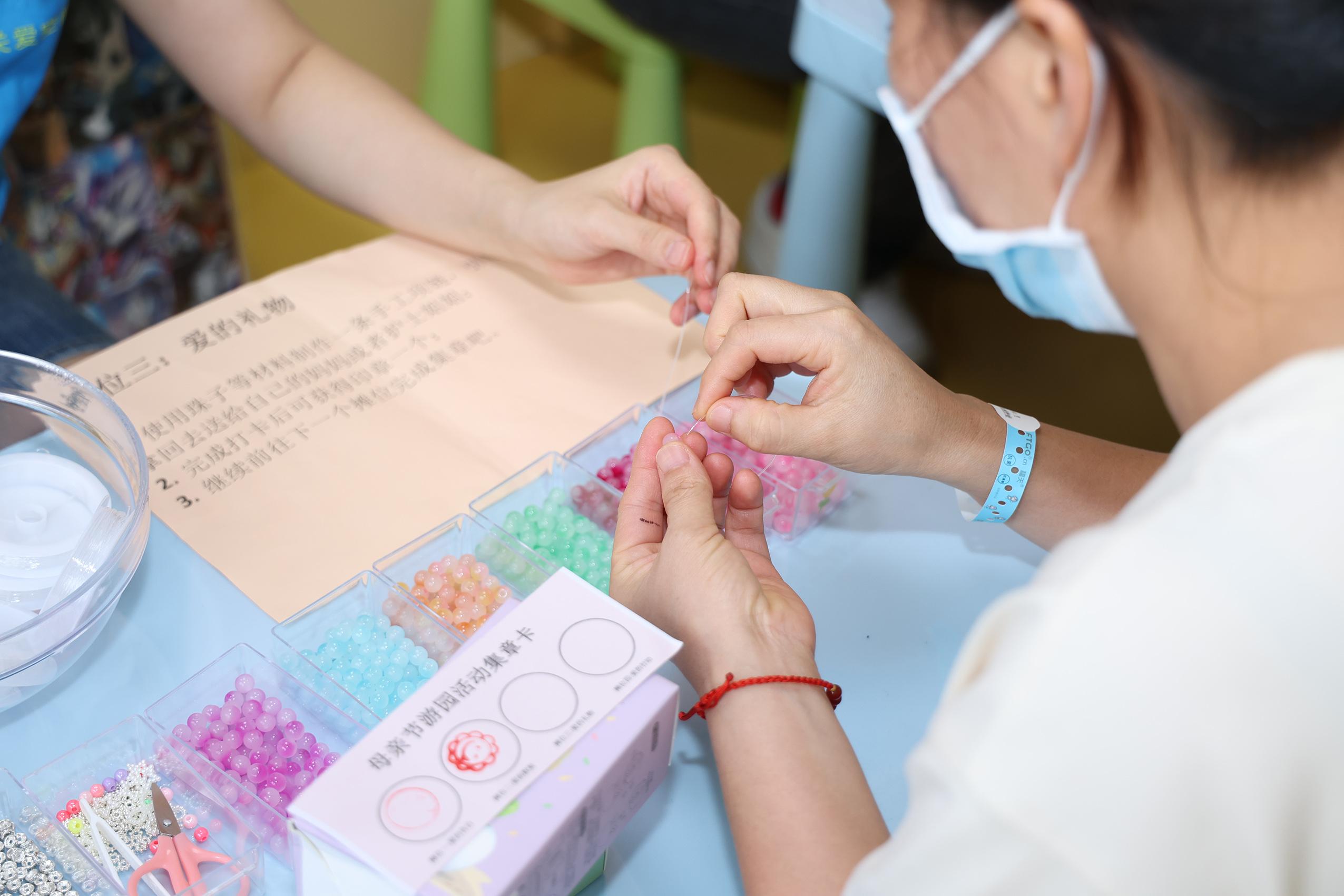 活動現(xiàn)場,孩子們在關(guān)愛空間社工的指導(dǎo)下,親手制作了蝶古巴特麻布袋、玫瑰花瓶、小紅花、女王花帽等手工藝品,并精心挑選了寶藏盒串手鏈作為節(jié)日禮物,送給自己的母親。這些禮物不僅代表了孩子們對母親深深的感激之情,也展現(xiàn)了他們獨(dú)特的創(chuàng)意和用心。此外,孩子們還借助透明相框描繪母親的樣貌,親手為母親制作了一幅畫像,用相機(jī)抓拍與母親在一起的美好瞬間,讓這份愛永遠(yuǎn)定格。
