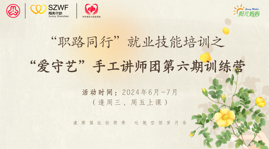 活動簡介:為幫助單親貧困、失業女性及家庭遭遇特殊困難的女性提升就業技能,深圳市婦聯陽光媽媽項目開展“愛守藝”手工講師團訓練營,幫助陽光媽媽學習手工授課技能,拓寬就業渠道,重返職場。