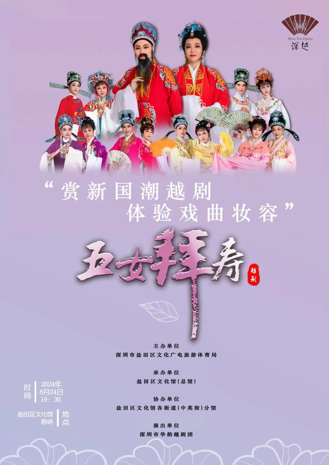 活動簡介:深圳市華韻越劇團將于8月24日在鹽田區(qū)文化館舉辦公益演出《五女拜壽》,本次公益活動由深圳市鹽田區(qū)文化廣電旅游體育局主辦,鹽田區(qū)文化館承辦。觀眾可著古裝或戲服免票入場,并有機會體驗戲曲妝容。演出由史濟華等資深藝術家指導,匯聚眾多優(yōu)秀演員。演出前,專業(yè)化妝師將現(xiàn)場打造古典妝容,讓您穿越千年,邂逅古典美。名額有限,點擊鏈接預約免費搶票,共享這場戲韻芬芳的文化盛宴。