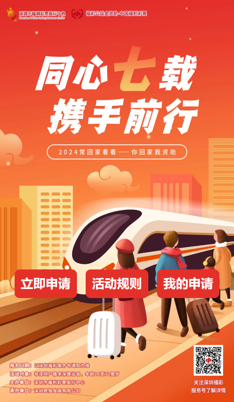 活動簡介:由深圳福彩主辦的“愛心福彩·?;丶铱纯础?第七屆公益活動于2024年8月23日至27日啟動申請登記。取得資助資格的非深圳戶籍來深建設者每人最高可獲1000元資助(提交車票據(jù)實資助)。本次活動計劃投入福彩公益金約90萬元,預計提供1200個資助名額。