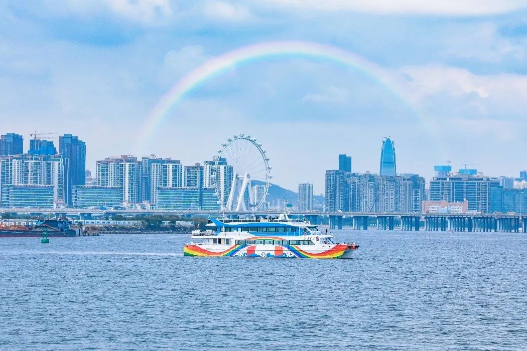 此次活動中,孩子們乘坐象征著希望與美好的 “海上彩虹號”,是寶安區(qū)首艘觀光游輪,由深圳航運(yùn)集團(tuán)與深圳機(jī)場碼頭聯(lián)合運(yùn)營,目前已開通前海灣和深中通道兩條航線,本次航程為深中通道觀光航線,途徑東西人工島,海上穿越深中大橋。