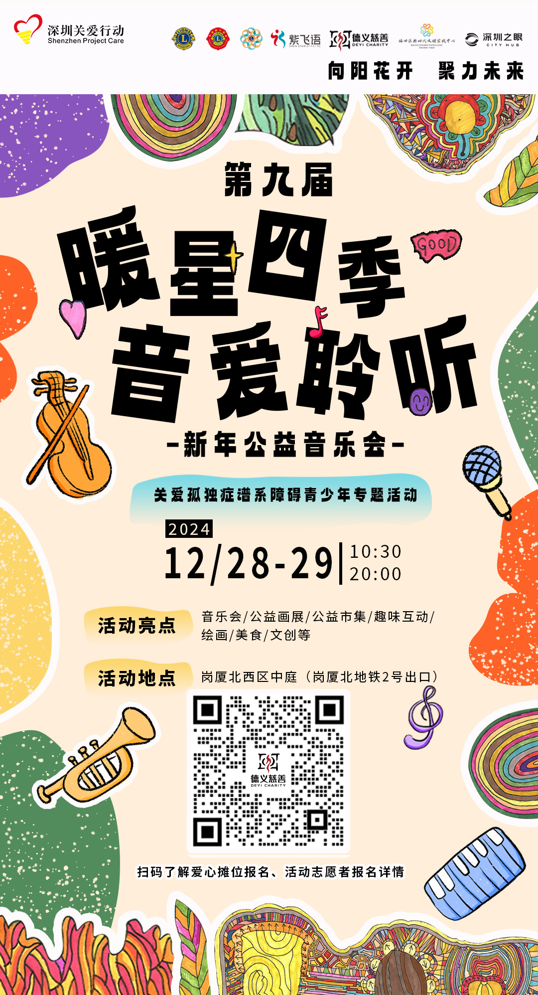 活動(dòng)簡(jiǎn)介:為打破對(duì)孤獨(dú)癥青少年的刻板印象,傳遞孤獨(dú)癥青少年的故事,并引導(dǎo)社會(huì)關(guān)注支持孤獨(dú)癥青少年群體,將于2024年12月28至29日在深圳崗廈北舉行的第九屆“暖星四季·音愛聆聽”新年公益音樂會(huì)——關(guān)愛孤獨(dú)癥譜系障礙青少年專題活動(dòng)的星星音樂會(huì)。