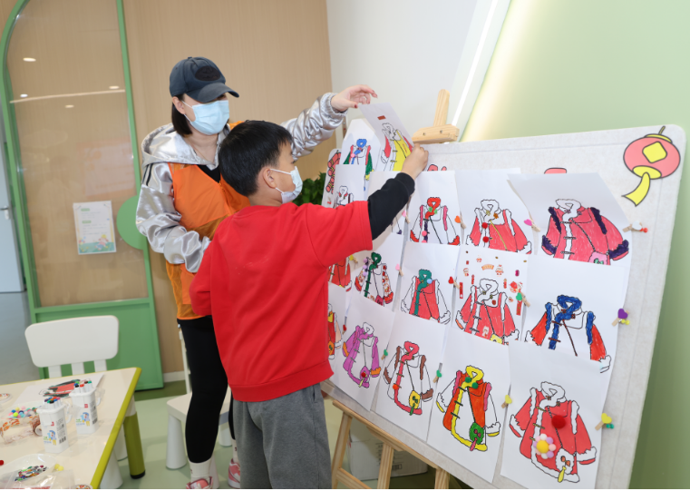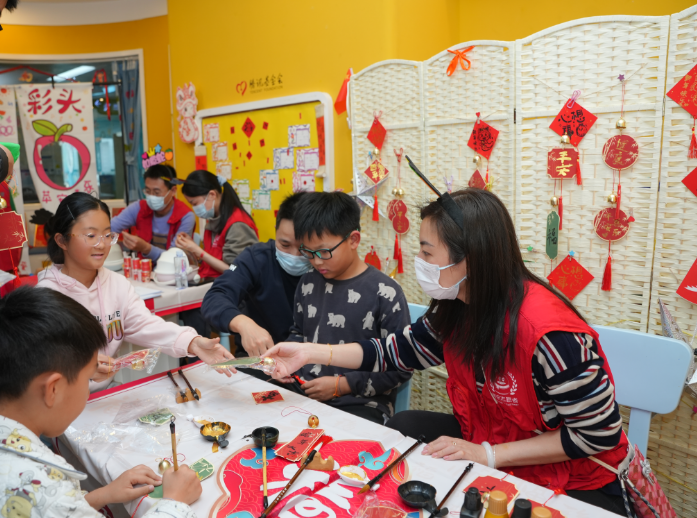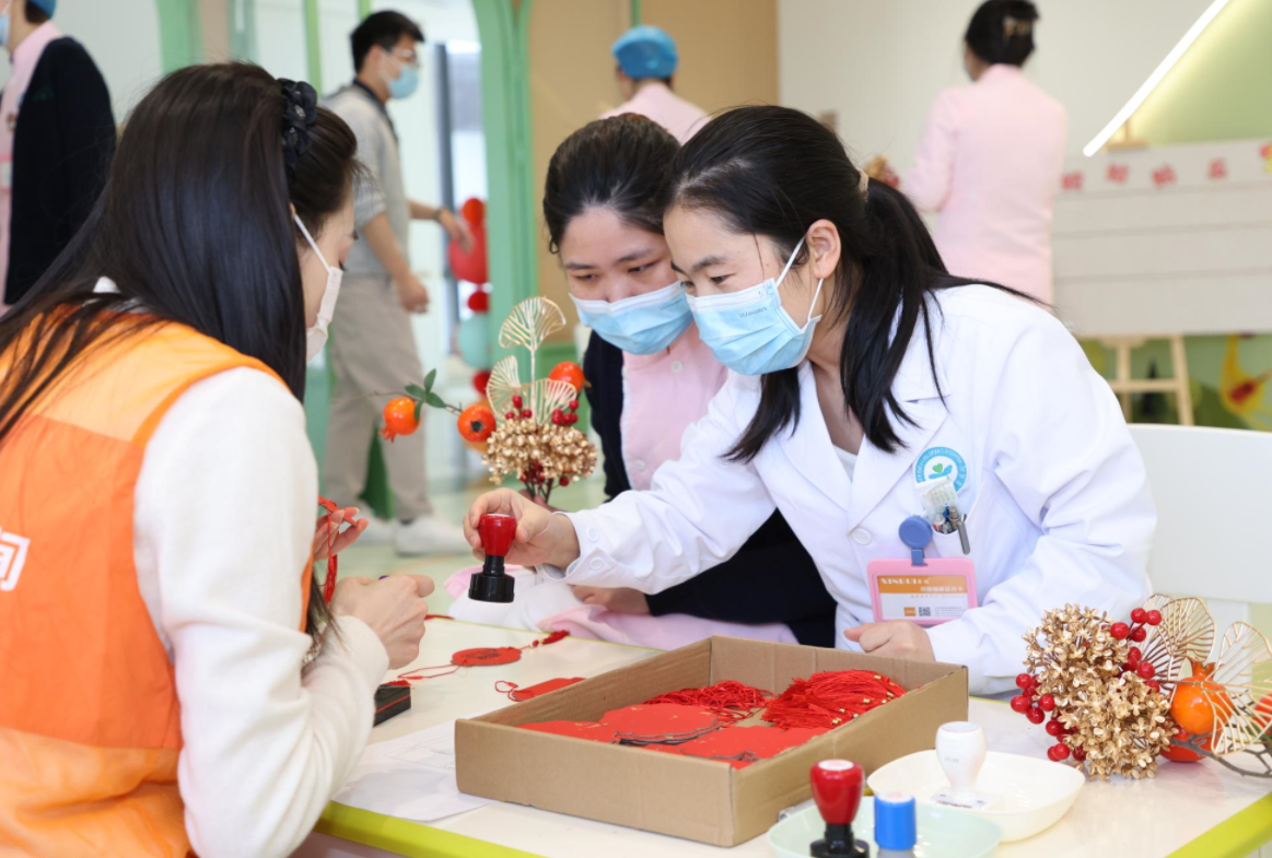游園會現場充滿了歡聲笑語,每個關愛空間的社工都結合所在科室的患兒特點及年齡,精心設計了不同的小游戲。活動從“集福袋”“寫新年祝?!薄凹履晷脑浮钡拳h節拉開序幕,隨后,“蛇舞連連”“蛇年emoji猜猜樂”“討個彩頭好巳來”“新年家庭秀”“球躍新春”等趣味游戲在各個空間依次展開。親子合作說繞口令、親子投球比賽等活動不僅讓孩子們在游戲中忘卻了病痛,還增進了親子之間的感情。此外,剪紙、燈籠傳統DIY、柿柿如意插花等傳統手藝文化體驗也讓孩子們感受到了濃濃的年味。