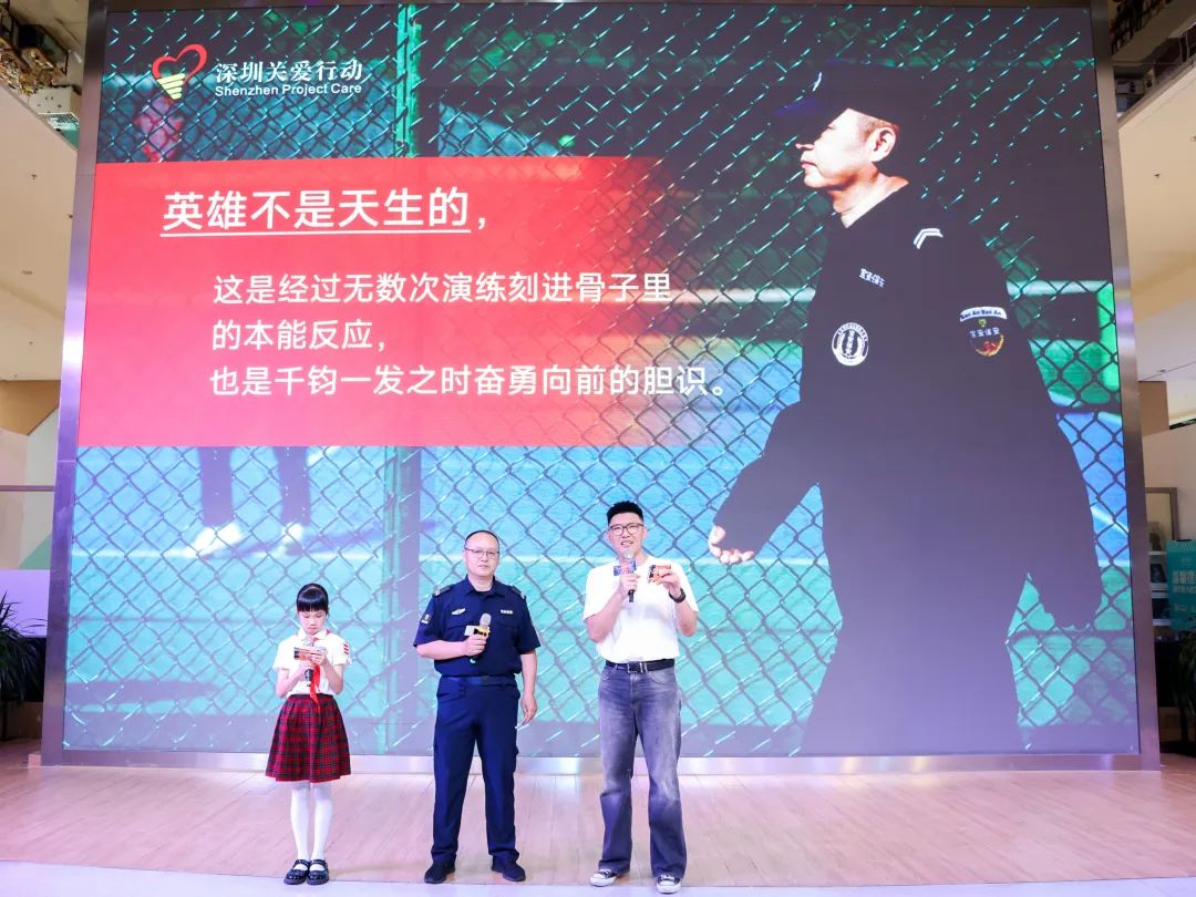 “叔叔加油啊!”活動現場,因被圍觀小朋友吶喊助威而持續勇敢施救的詹揚櫻也與觀眾分享了自己的故事。他們與來自園嶺教育集團園嶺小學的小主持人陳雅彤共同重現了感人至深的施救場景,也為現場觀眾帶來了一場生動的生命教育。