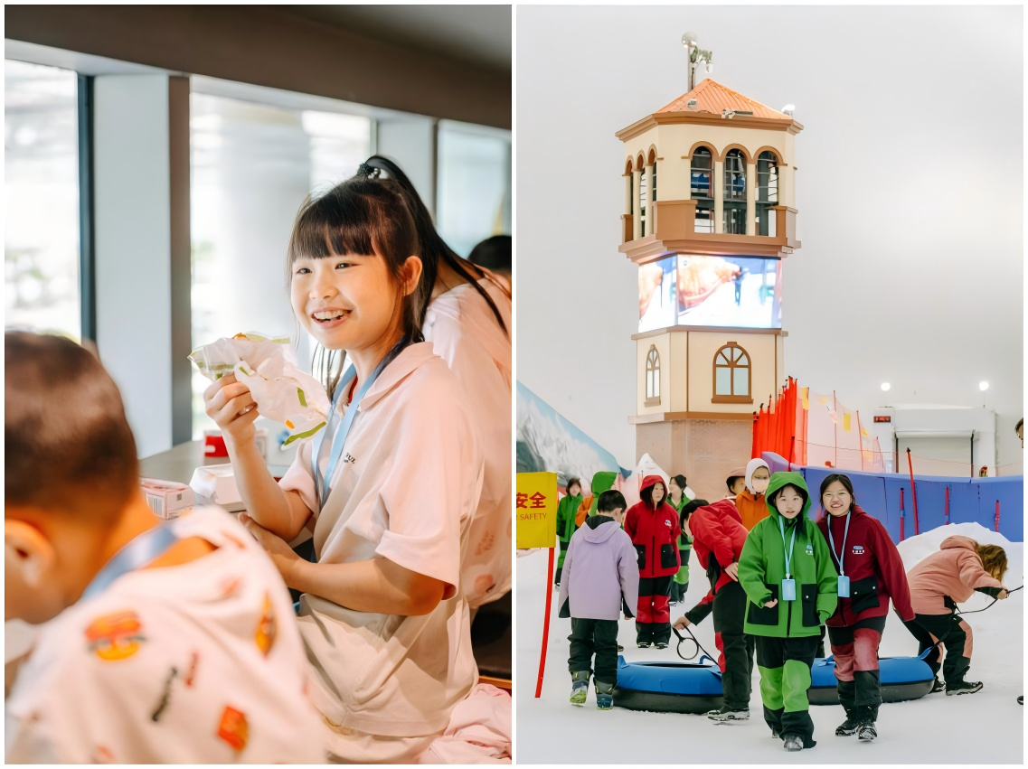結束生態園的探秘,“小候鳥”們在麥當勞享用午餐補充能量后,便滿懷期待地奔赴觀瀾湖卡魯冰雪世界。踏入這片晶瑩剔透的冰雪天地,午后的燥熱瞬間消散,歡笑聲立刻點亮了整個空間。對于許多來自南方的孩子來說,這是第一次與雪的親密接觸。冰滑梯上劃過的尖叫、雪圈飛馳揚起的雪霧與暢快笑聲、雪球紛飛間的追逐嬉鬧、憨態可掬的雪人笑臉……構成了一幅生動的畫卷?!拔覐臎]見過雪!”來自廣西的14歲秦同學難掩激動,“第一次玩雪,下次有機會想和爸爸媽媽一起來!”
