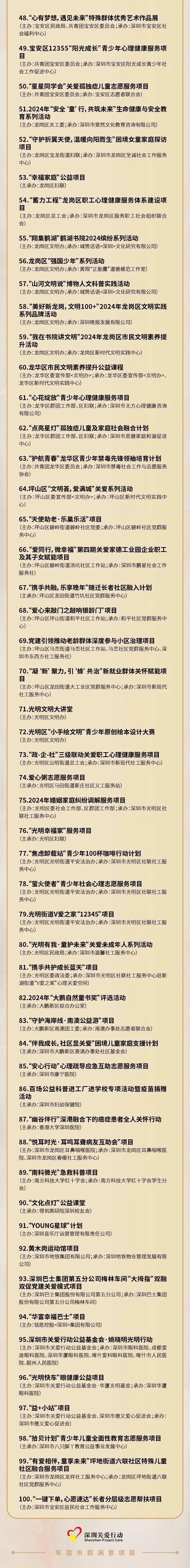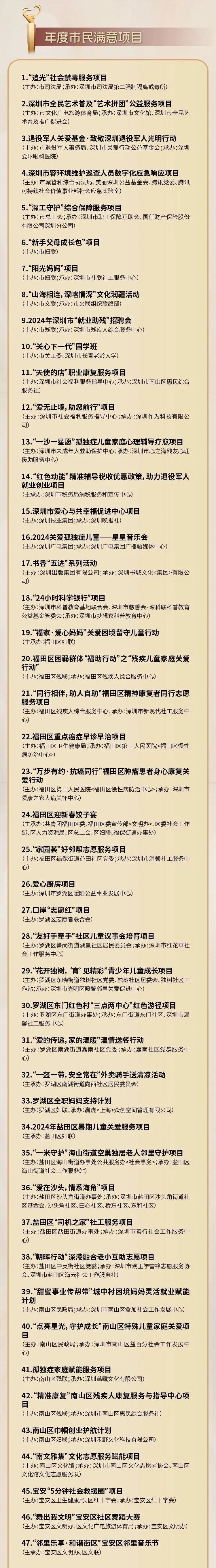 深圳關愛行動自2003年啟動以來,已持續開展22年,逐漸成為這座城市精神文明建設的亮麗名片。100個“年度市民滿意項目”,涵蓋助老扶弱、心理健康、公共空間改造、青少年成長、社區融合等多個方面,反映出深圳在推動高質量發展過程中,始終將民生關切與社會和諧擺在突出位置。